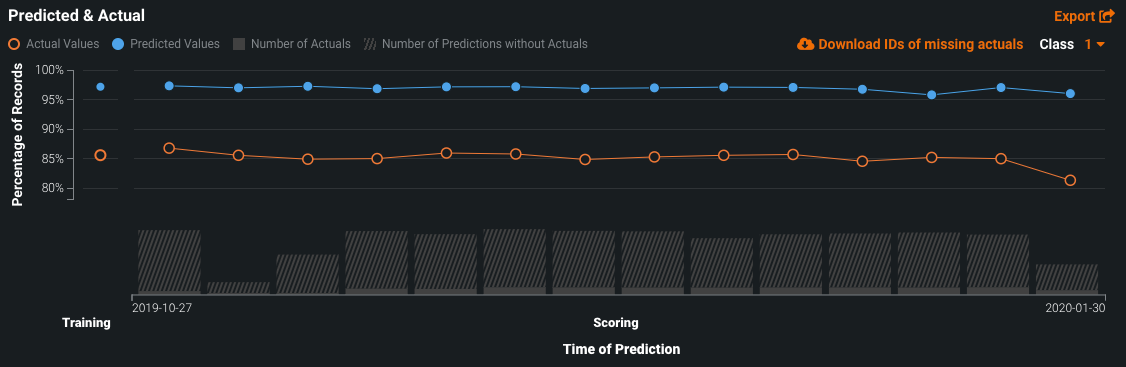 The volume chart below the graph displays the number of actual values that correspond to the predictions made at each point. The shaded area represents the number of uploaded actuals, and the striped area represents the number of predictions missing corresponding actuals.