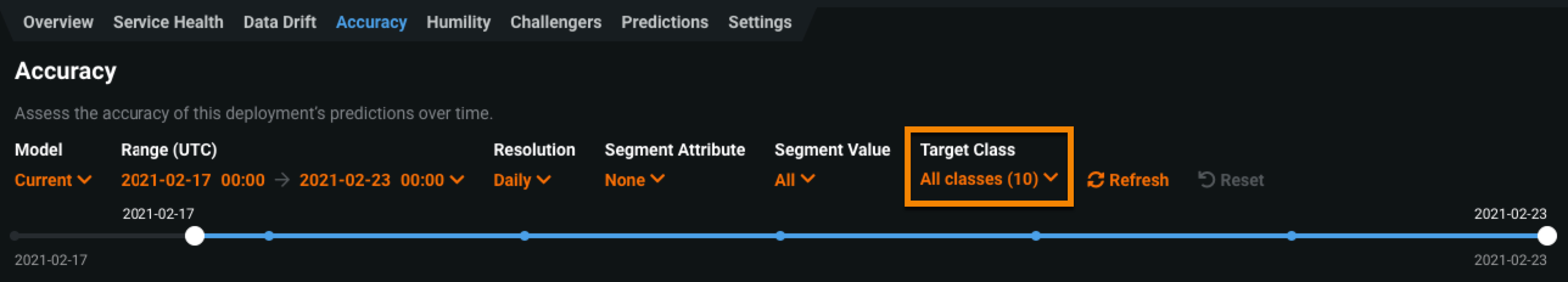 Multiclass deployments offer class-based configuration to modify the data displayed on the Accuracy graphs. By default, the graphs display the five most common classes in the training data. All other classes are represented by a single line. Above the date slider, there is a Target Class dropdown. This indicates which classes are selected to display on the selected tab.
