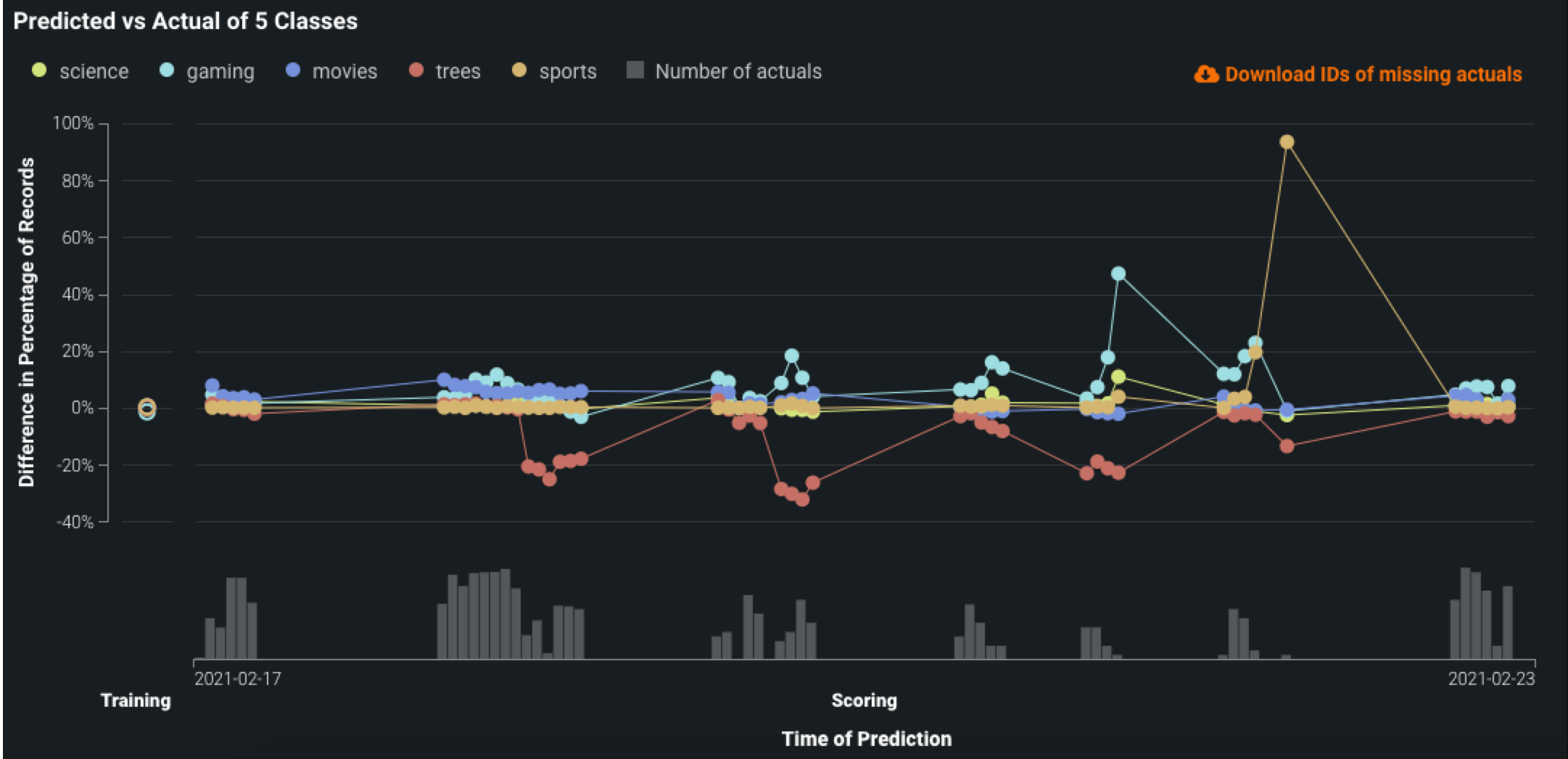 The graph above shows the predicted and actual values along a timeline of a binary classification dataset. Hovering over a point in either plot shows the same values as those on the Data Drift tab (assuming the time sliders are set to the same time range).