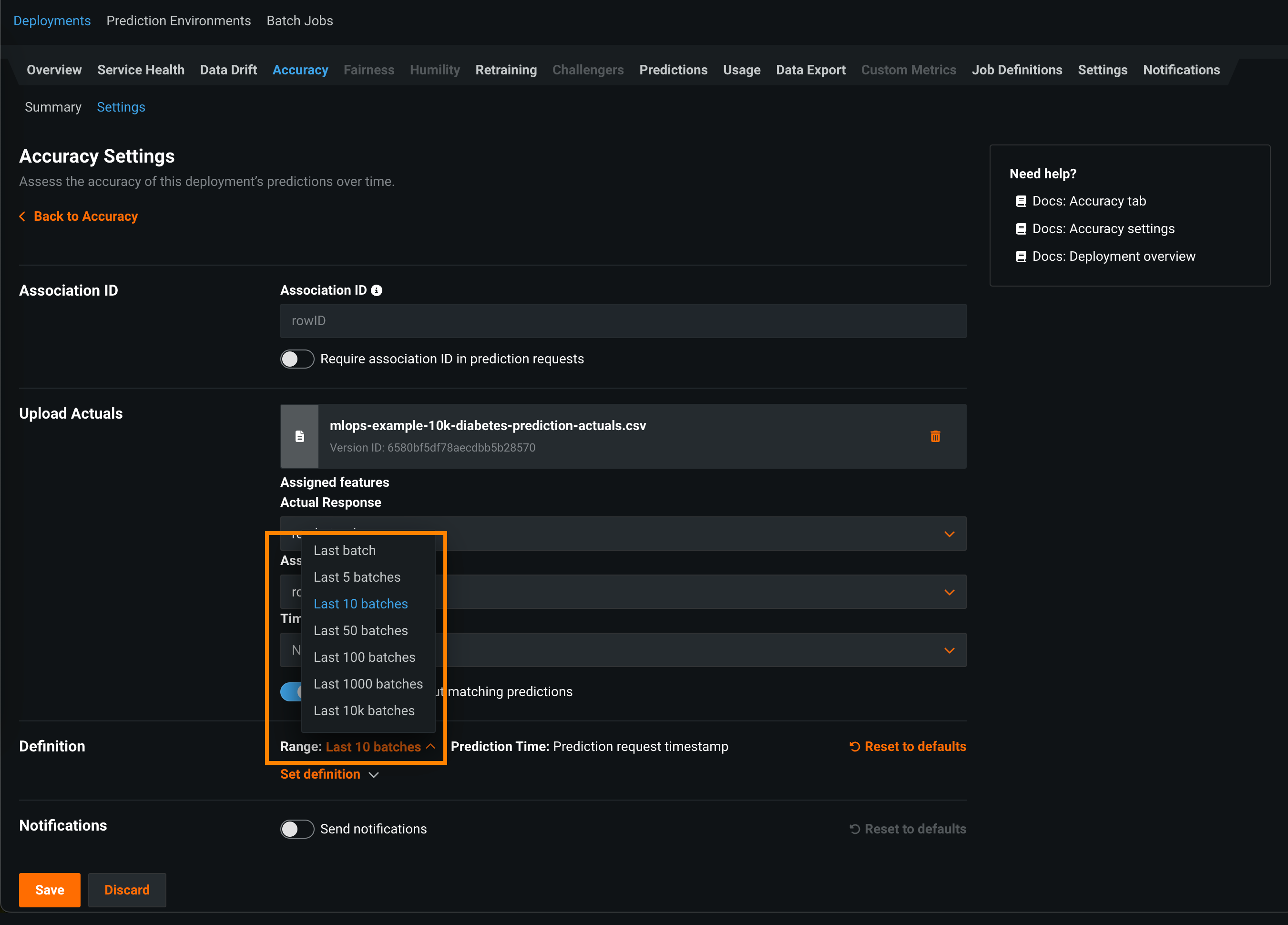 On the Accuracy > Settings tab, in the Definition section, select the Range of prediction batches to include in the deployment inventory's Accuracy indicator and click Save: