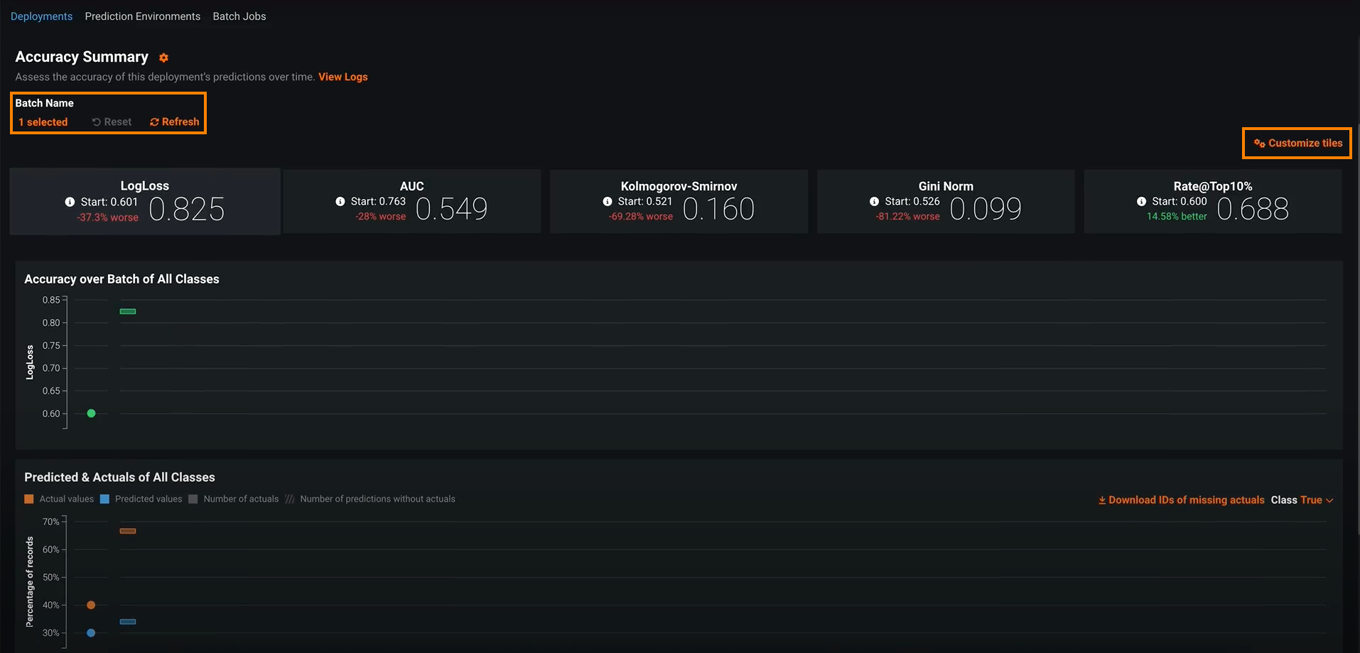 On the Accuracy tab, you can view the accuracy metric values for a batch deployment. You can use the Batch Name selector to determine which batches are included. In addition, to customize the metrics visible on the tab, you can click Customize tiles:
