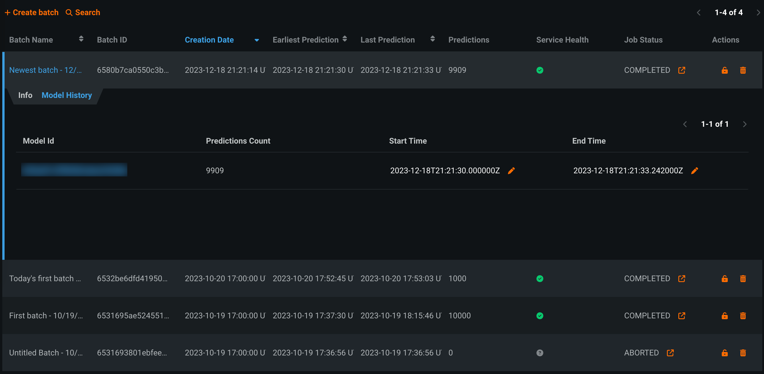 In the list below, you can view basic batch information, including the Batch Name, Batch ID, Creation Date, Earliest Prediction, Latest Prediction, and the number of Predictions.