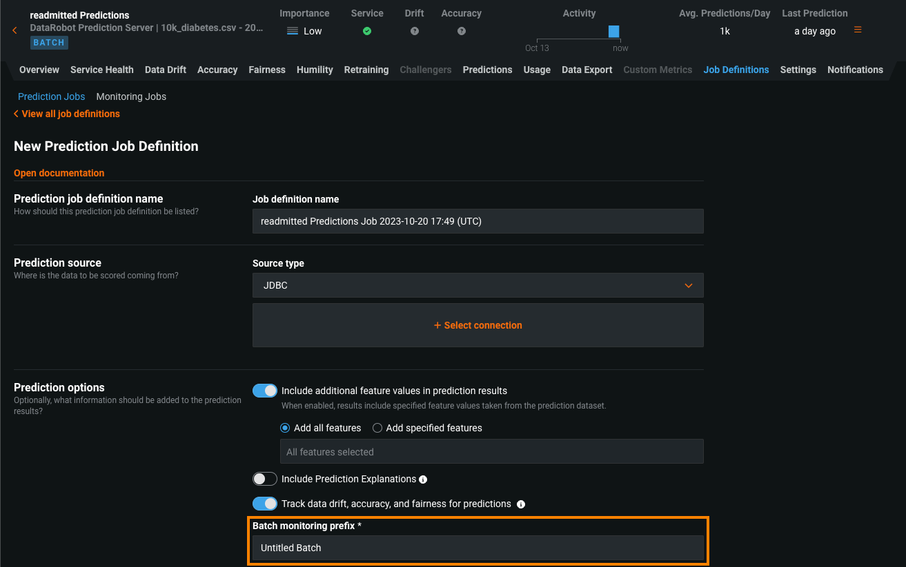 On the Predictions > Prediction Jobs tab, you can click + Add job definition to create a recurring batch prediction job as you would for a standard deployment; however, for batch deployments, you can also configure the Batch monitoring prefix to append to the prediction date and time in the Batch Name on the Batch Management tab: