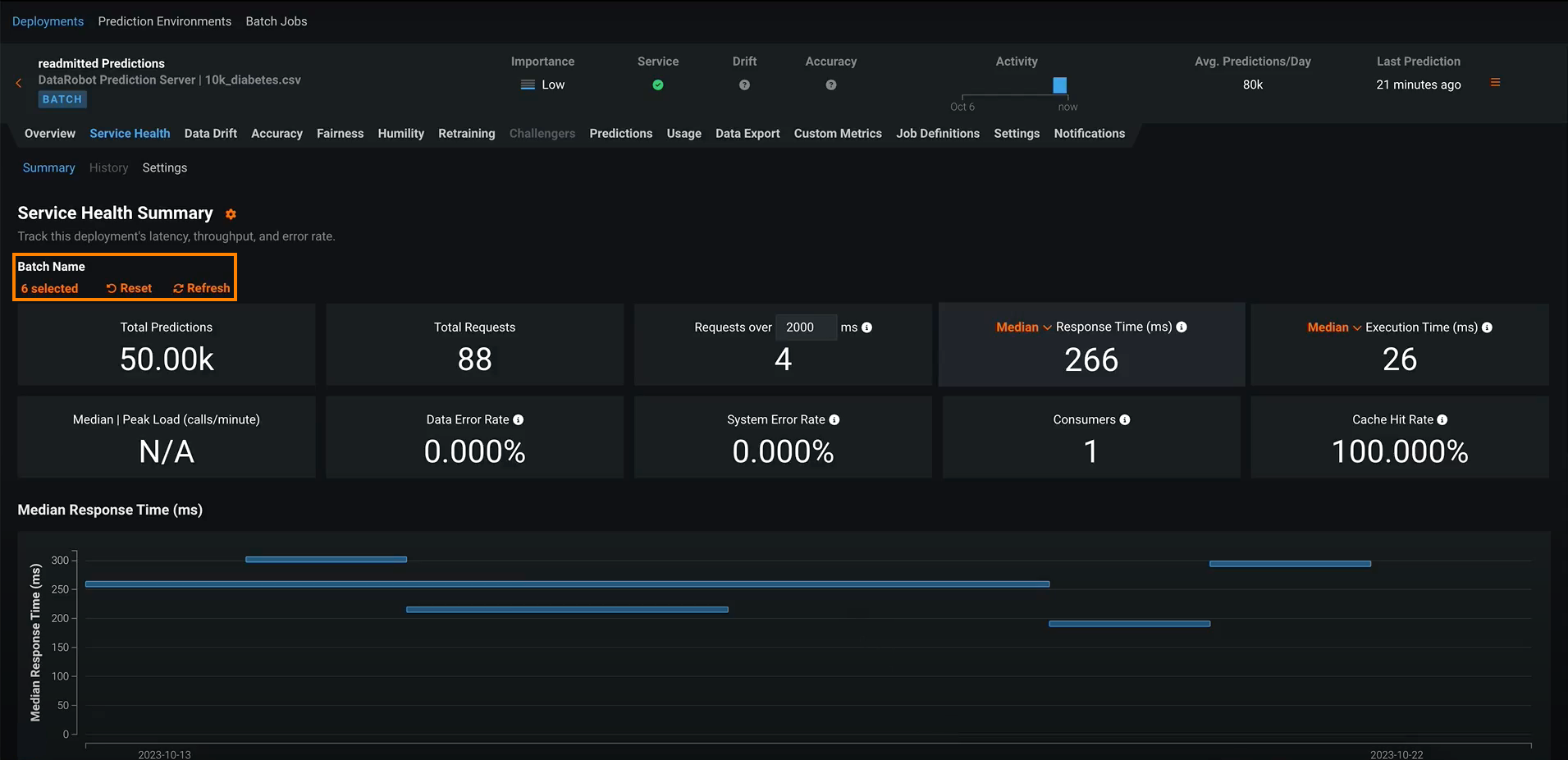 | Service Health | Indicates if there are any predictions with 400 or 500 errors in this batch. |