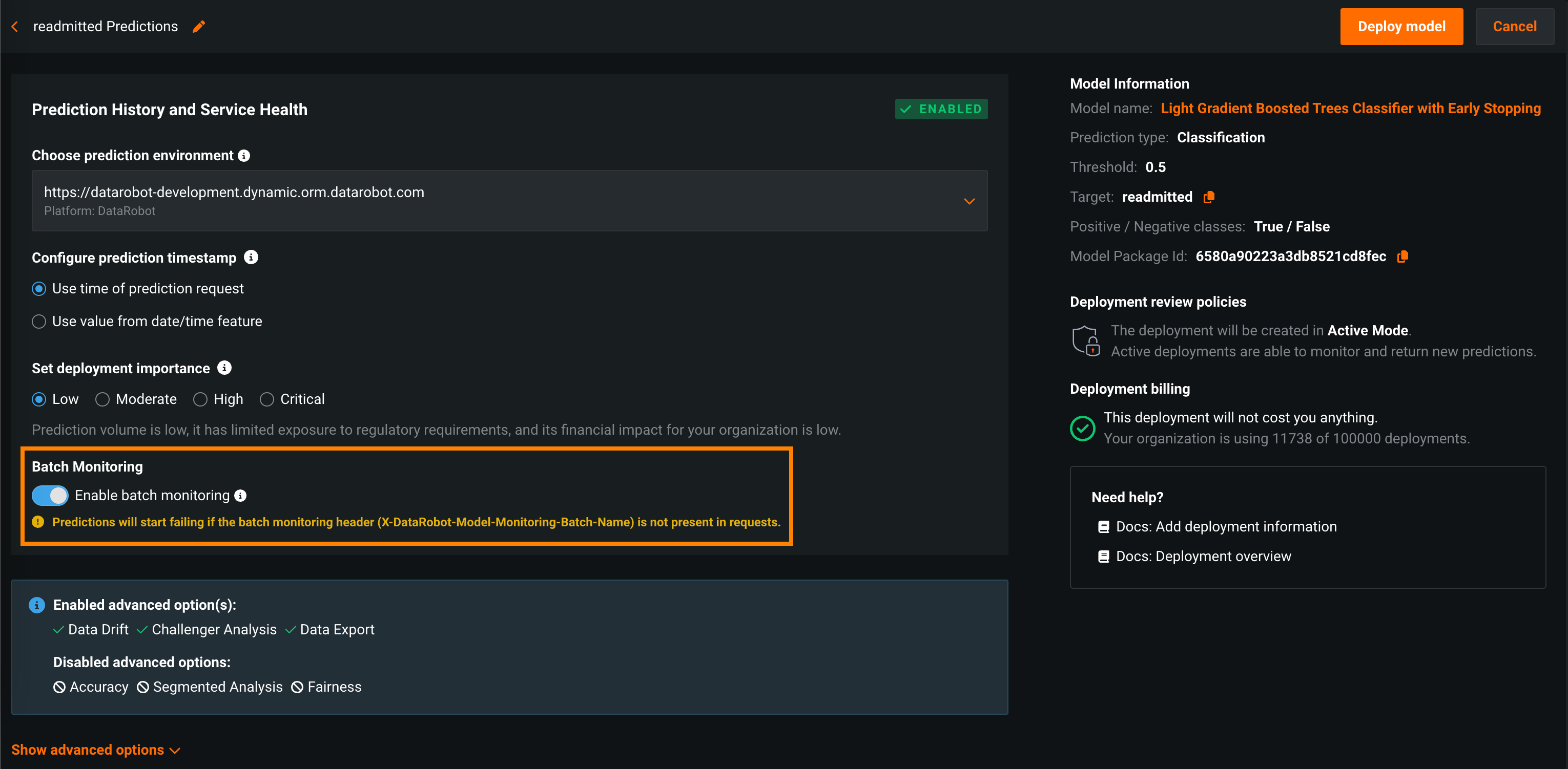 To enable batch monitoring for this deployment, in the Prediction History and Service Health section, locate Batch Monitoring and click Enable batch monitoring: