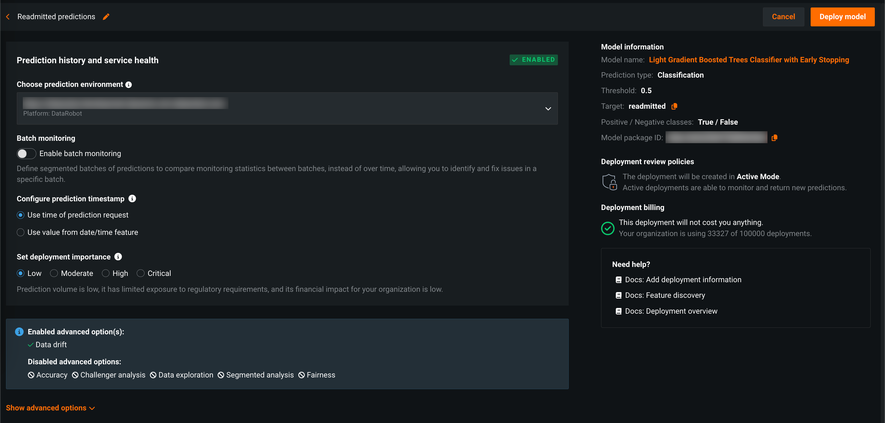 If you already created the deployment you want to configure for batch monitoring, navigate to that deployment's Predictions > Settings tab. Then, under Predictions Settings and Batch Monitoring, click Enable batch monitoring and Save the new settings: