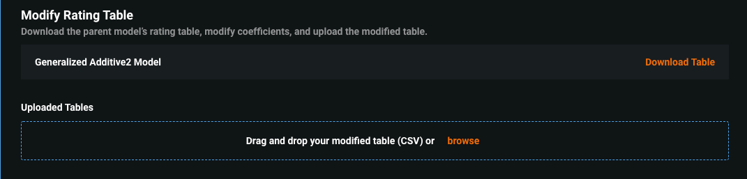 | Download Table | Download the rating table of the child model. To iterate on coefficient changes in a table, download the child's rating table, upload the modified child rating table to the parent, compare scores, and continue the process as necessary. |