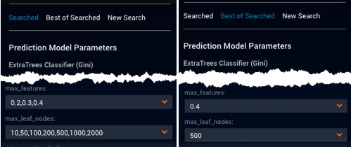 Search lists all the values searched; Best of Searched lists only the value that yielded the best model results—in this case, 0.4 for max_features and 500 for max_leaf_nodes.