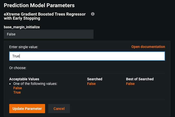 | Parameters (1) | Displays either all parameters searched or the single best value of all searched values for preprocessing or final prediction model parameters. Refer to the acceptable values guidance to set a value for your next search. Click the documentation link in the upper right corner to access the documentation specific to the model type. See the Eureqa Advanced Tuning Guide for information about Eureqa model tuning parameters. |