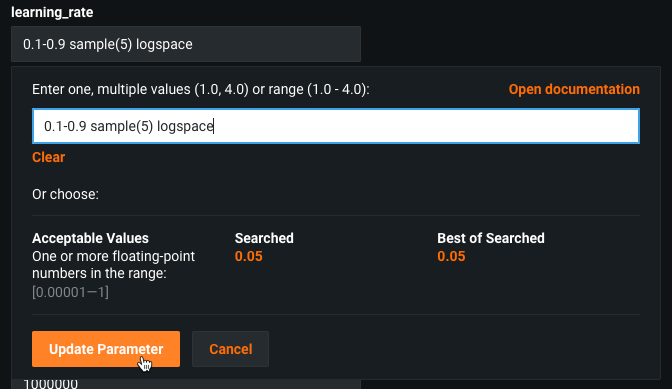 0.5-1.0), DataRobot samples 10 points linearly from that range by default. However, you can customize the sampling. For example, use0.1-0.9 sample(5) logspaceto sample 5 values in log space rather than in linear space.
