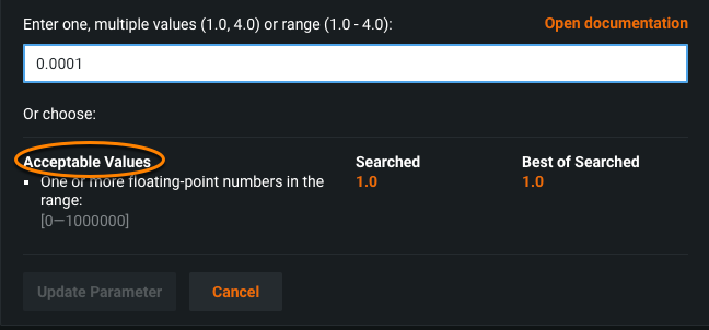 - Type a value into the field. Refer to the Acceptable Values field, which lists either constraints for numeric inputs or predefined allowed values for categorical inputs (“selects”). To enter a specific numeric, type a value or range meeting the criteria of Acceptable Values: