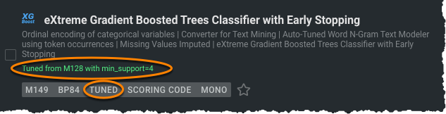 With Advanced Tuning, you can set values for a large number of preprocessing tasks, with availability dependent on the model and project type. When you tune a parameters, DataRobot adds that information below the model description on the Leaderboard.