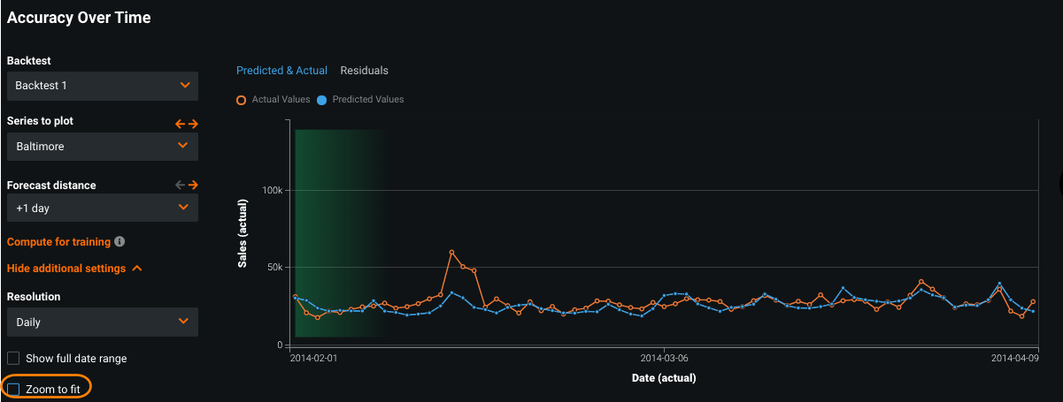 There are two plots available in the Accuracy Over Time tab—the Predicted & Actual and the Residuals plots.