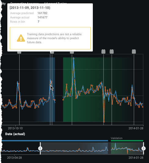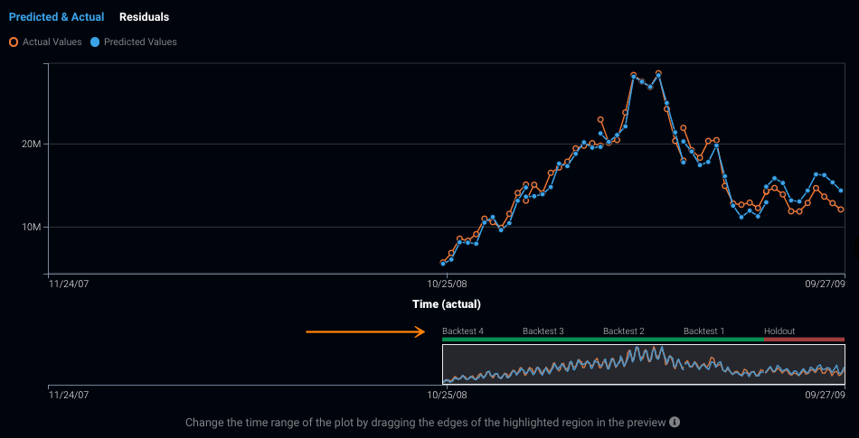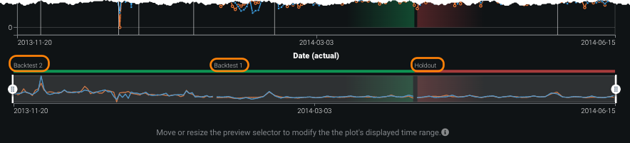 The Predicted & Actual Over Time chart represents the actual values by open orange circles. Predicted values based on the validation set are represented by blue solid circles, which corresponds to the blue in the backtest representation. You can additionally compute and include predictions on the training data for each backtest. The bar below the chart indicates the division between training and validation data.