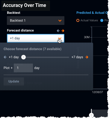 Setting a different forecast distance modifies the display to visualize predictions for that distance. For example, "show me the predicted vs. actual validation data when predicting each point two days in advance." Click the left or right arrow to change the distance by a single increment (day, week, etc.); click the down arrow to open a dialog for setting the distance.
