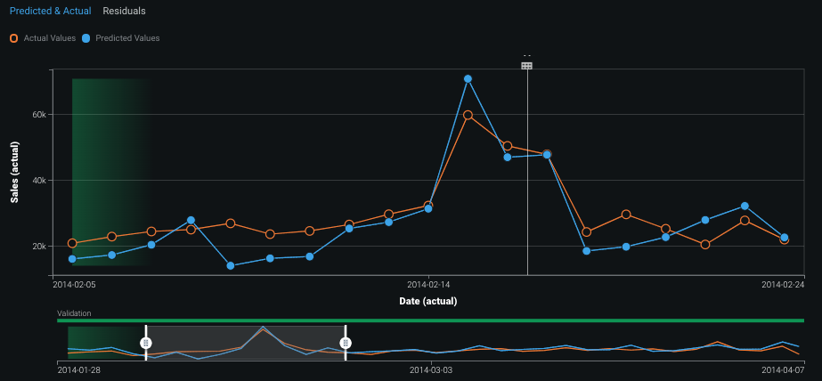 This visualization differs somewhat between OTV and time series modeling. With time series, in addition to the standard features of the tool, you can display based on forecast distances (the future values range you selected before running model building).