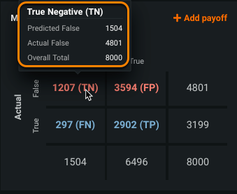 The ROC Curve tab provides a confusion matrix that lets you evaluate accuracy by comparing actual versus predicted values. The confusion matrix is a table that reports true versus predicted values. The name “confusion matrix” is used because the matrix shows whether the model is confusing two classes (consistently mislabeling one class as another class).