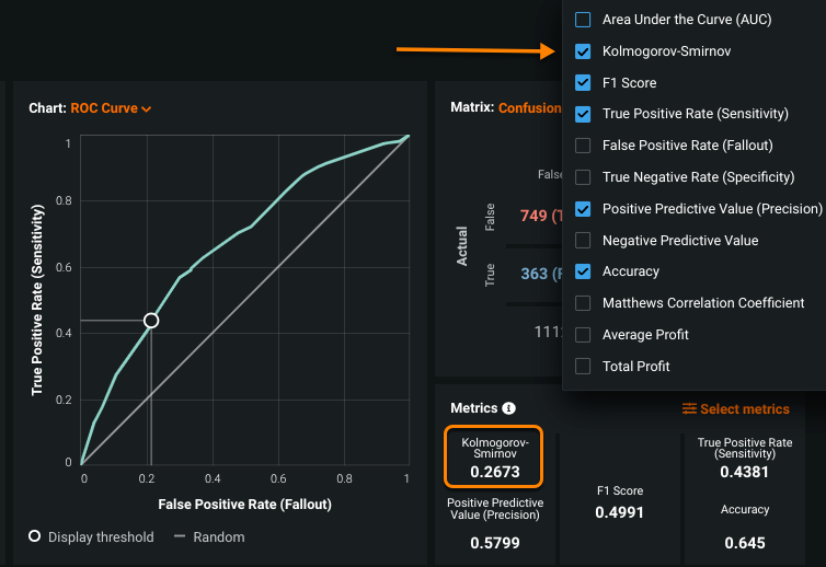 The KS metric does not display automatically in the Metrics pane. Click Select metrics and select Kolmogorov-Smirnov Score to display it.