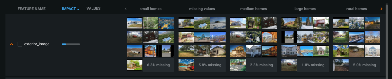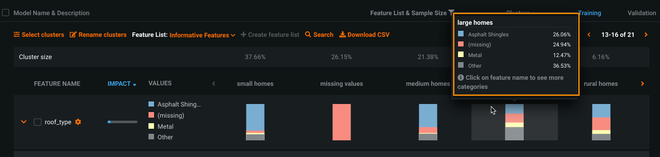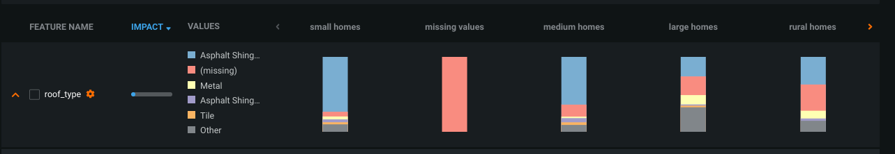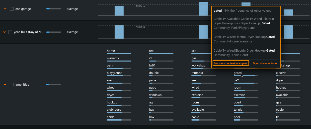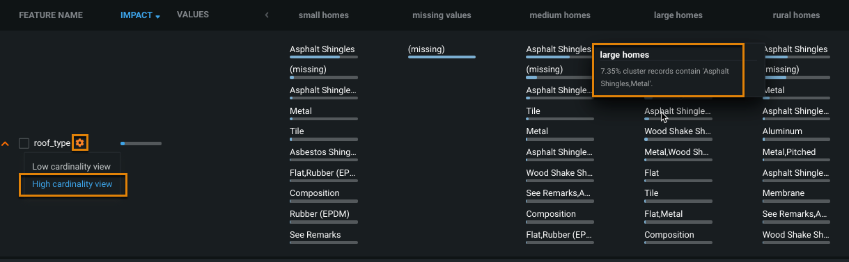To drill into the categories, click the gear icon next to the feature name and select High cardinality view. Hover to see the percentage of records that have each value.