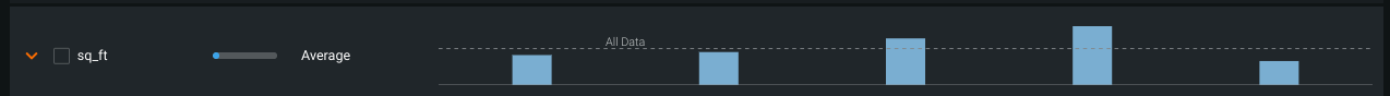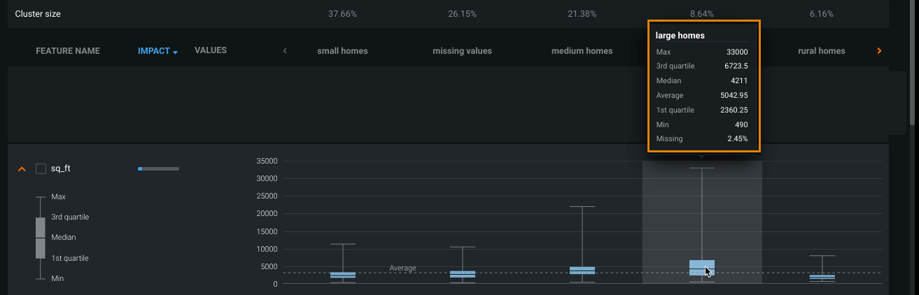 Click near the feature name to expand. Hover over the blue bar for each cluster to view the maximum, median, average, minimum, the percentage missing, and the 1st and 3rd quartiles.