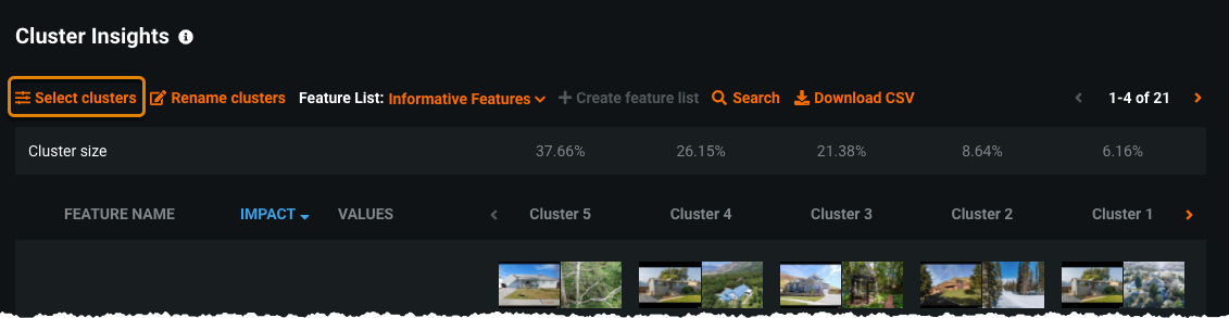 Element Description 1 Select clusters Click to select clusters to view or remove from view. 2 Rename clusters Name clusters after you gain an understanding of what they represent. 3 Feature List By default, DataRobot builds clustering models using the Informative Features list, although you can select another feature list to compare other features. Analyzing features not used to generate the clusters can still be useful, for example, to answer questions like "How does income distribute among my clusters, even if I'm not using it for clustering?" 4 Download CSV Click to download the cluster insights. The CSV contains the information displayed in the Cluster Insights visualization, and more detailed feature data. 5 Feature page control Page through to view more features. 6 Clusters Clusters display in columns of features (four features display by default). Cluster sizes are shown above (in percentages). Clusters are sorted by size from largest to smallest. 7 Cluster arrow Click to view more clusters. The rightmost cluster contains 100% as a baseline comparison. 8 Features Features are sorted by feature importance. The Informative Feature list displays by default, but you can select another feature list. -