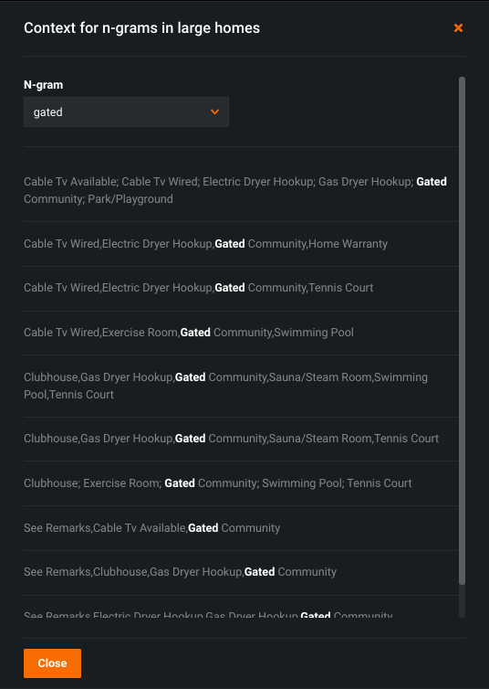 For text features, Cluster Insights shows n-grams ranked by importance (highest to lowest). These are displayed as blue bars that represent the relative importance. To see the actual importance value, download the CSV.