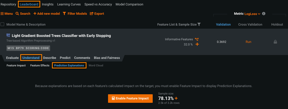 To access and enable Prediction Explanations, select a model on the Leaderboard and click Understand > Prediction Explanations.