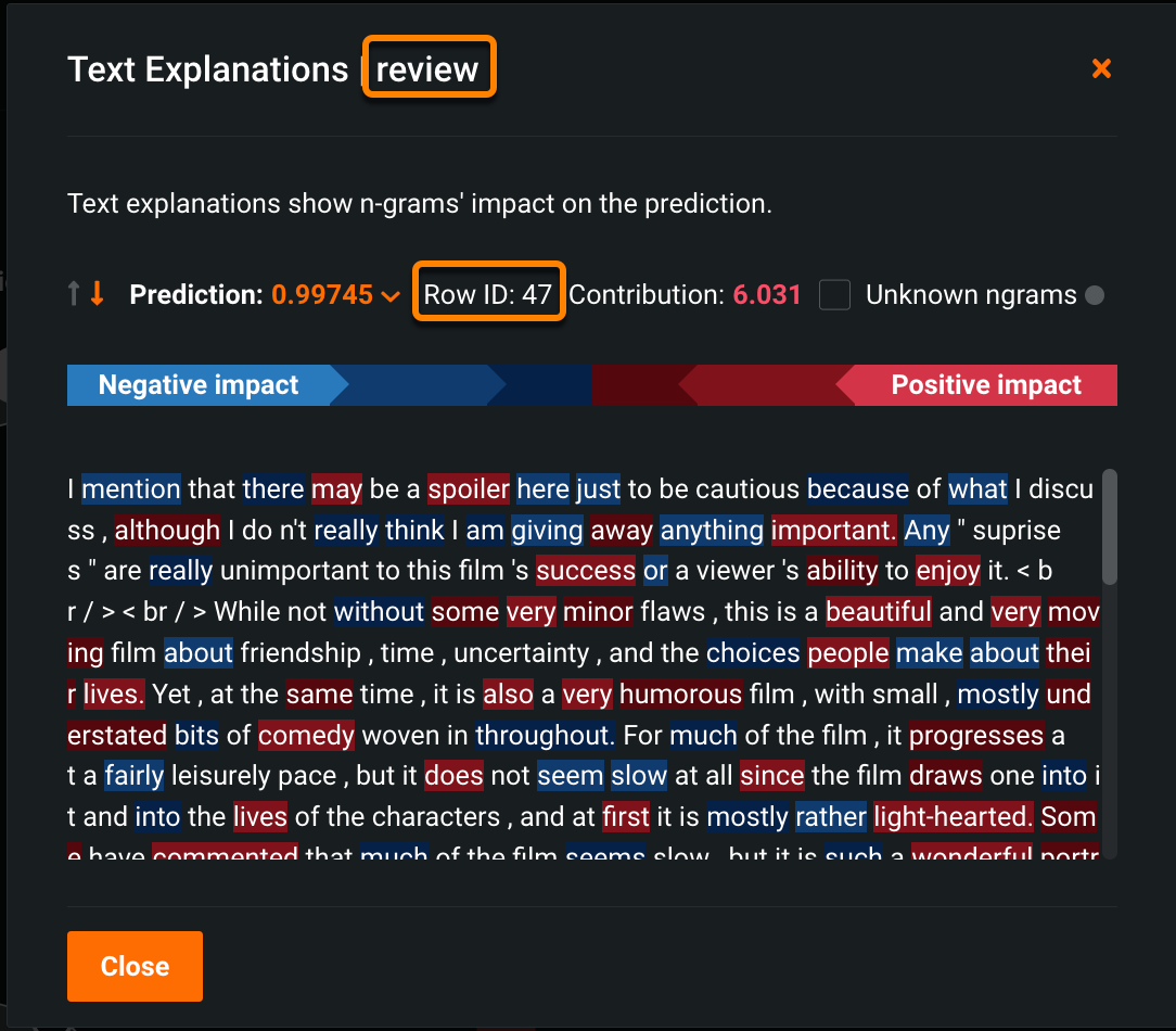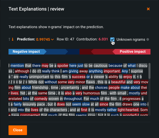 Text Explanations help to visualize the impact of different n-grams by color (the n-gram impact scores). The brighter the color, the higher the impact, whether positive or negative. The color palette is the same as the spectrum used for the Word Cloud insight, where blue represents a negative impact and red indicates a positive impact. In the example below, the text shown represents the content of one row (row 47) in the feature column "review."