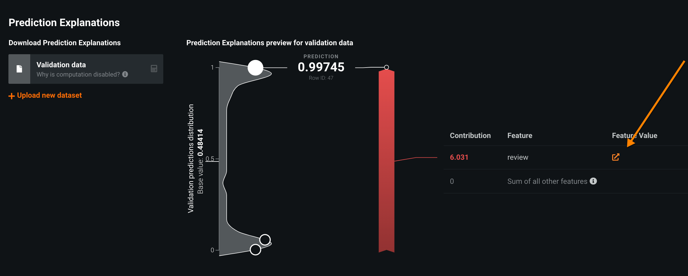 Compute explanations as you would with standard Prediction Explanations. You can upload additional data using the same model, calculate explanations, and then download a CSV of results. The output for XEMP and SHAP differs slightly.