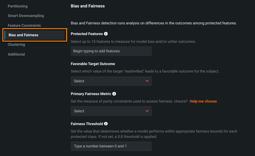 To configure Bias and Fairness, set the values that define your use case. For additional detail, refer to the bias and fairness reference for common terms and metric definitions.
