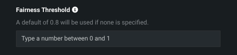 Set a Fairness Threshold for the project. The threshold serves as a benchmark for the model's fairness score. That is, it measures if a model performs within appropriate fairness bounds for each protected class. It does not affect the fairness score or performance of any protected class. (See the reference section for more information.)