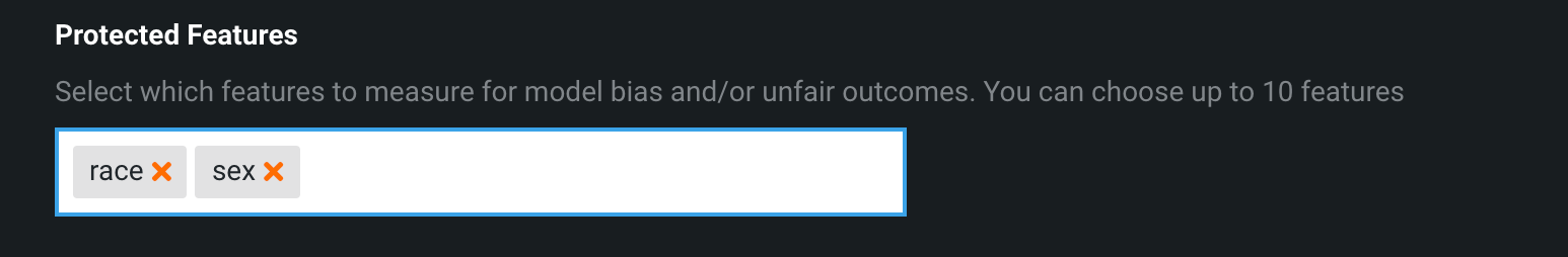 Identify up to 10 Protected Features in the dataset. Protected features must be categorical. The model's fairness is calculated against the protected features selected from the dataset.