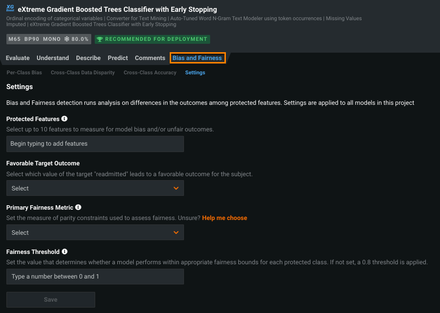 If you haven't previously completed the Bias and Fairness configuration in advanced options prior to model building, you must first set those fields via the Bias and Fairness > Settings tab.