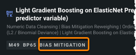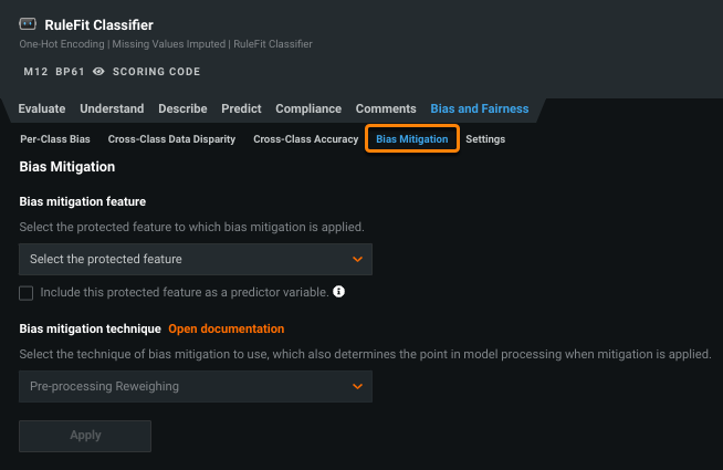 Expand any eligible Leaderboard model and open Bias and Fairness > Bias Mitigation.