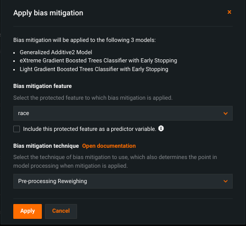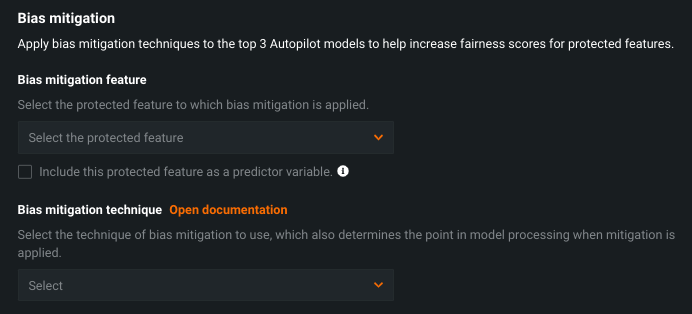 | Bias mitigation technique | Sets the mitigation technique and the point in model processing when mitigation is applied. |