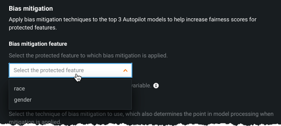 | Bias mitigation feature | Lists the protected feature(s); select one from which to reduce the model's bias towards. |