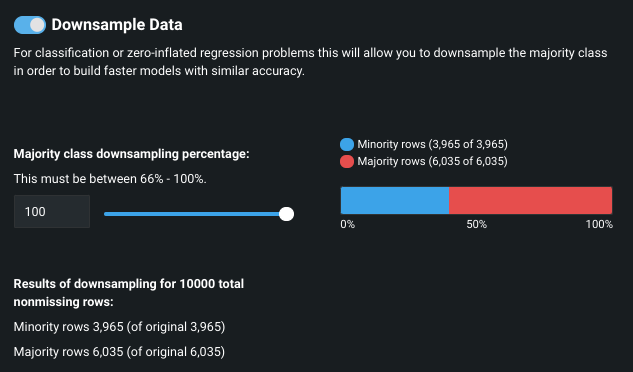 By typing in the box or using the slider, enter the majority class downsampling percentage rate. Note the following:
