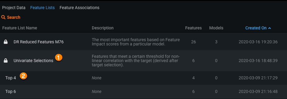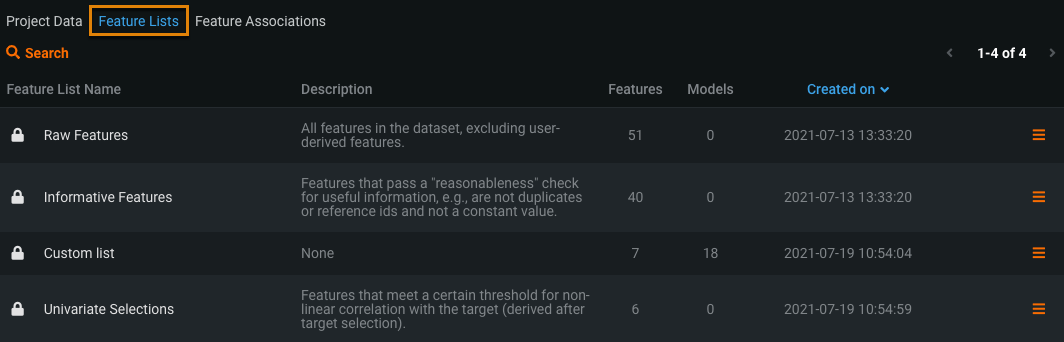 The Feature Lists tab of the Data page provides a mechanism for managing feature lists. It provides a summary (name, number of features, number of models, created date, and description) of DataRobot-created and custom feature lists and allows you to delete or rename (some) lists to help avoid clutter and confusion. A lock(