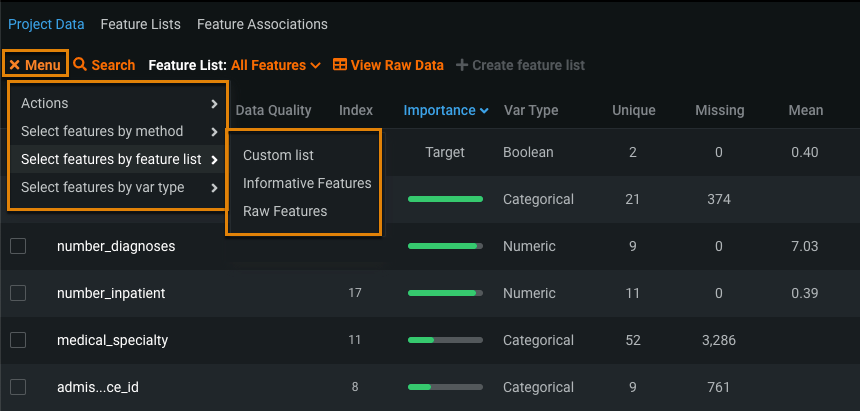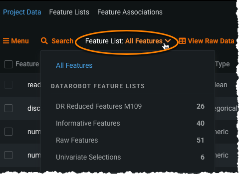Note that the Project Data tab defaults to showing All Features, which is not actually a feature list but instead a way to view every feature in the dataset.