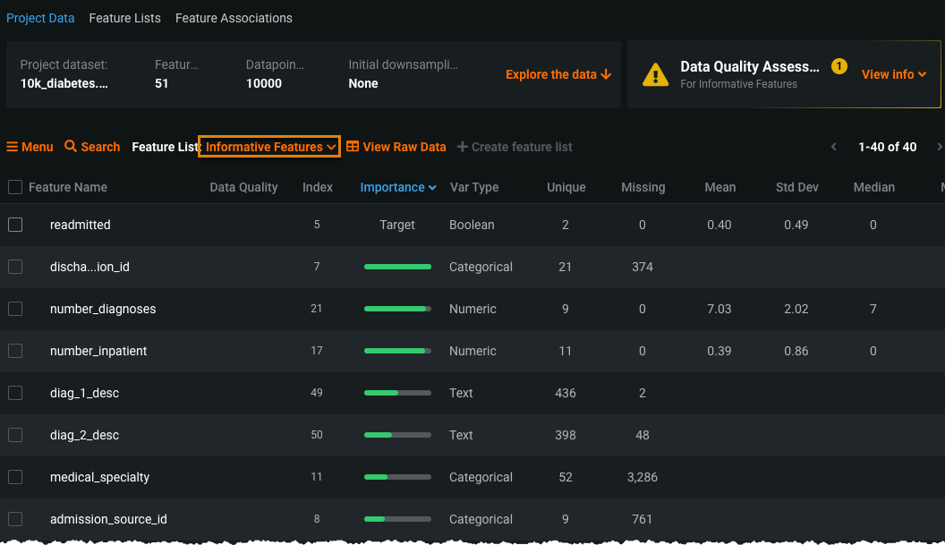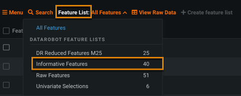 | Informative Features | The default feature list if DataRobot does not detect target leakage. This list includes features that pass a "reasonableness" check that determines whether they contain information useful for building a generalizable model. For example, DataRobot excludes features it determines are low information or redundant, such as duplicate columns, a column containing all ones or reference IDs, a feature with too few values, and others. Informative features are sorted to the top of the Features list. |