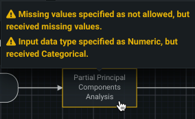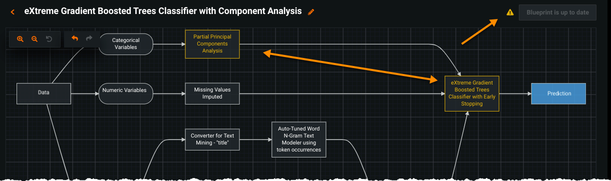 DataRobot validates each node based on the incoming and outgoing edges, checking to ensure that data type, sparse vs. dense data, and shape (number of columns) requirements are met. If you have made changes that cause validation warnings, those affected nodes are displayed in yellow on the blueprint:
