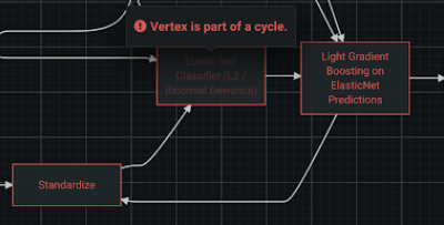 In addition to checking a task's input and output, DataRobot validates that a blueprint doesn't form cycles. If a cycle is introduced, DataRobot provides a warning, indicating which nodes are causing the issue.