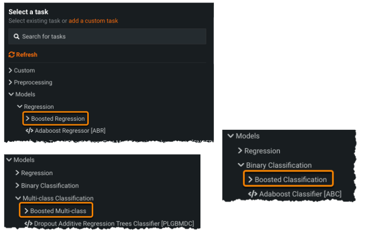• Booster task: A node that boosts the predictions (Text fit on Residuals (L2/Binomial Deviance) in the example above). The list of built-in booster tasks available can be found in the task selector under Models > Regression > Boosted Regression (or similarly under the other Models sub-categories). For example:
