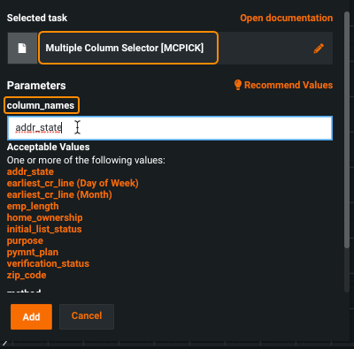 To pass a single or group of columns into a task, use the Task Multiple Column Selector. This task selects specific features in a dataset such that downstream transformations are only applied to a subset of columns. To use this task, add it directly after a data type (for example, directly after “Categorical Variables”), then use the task’s parameters to specify which features should or should not be passed to the next task.