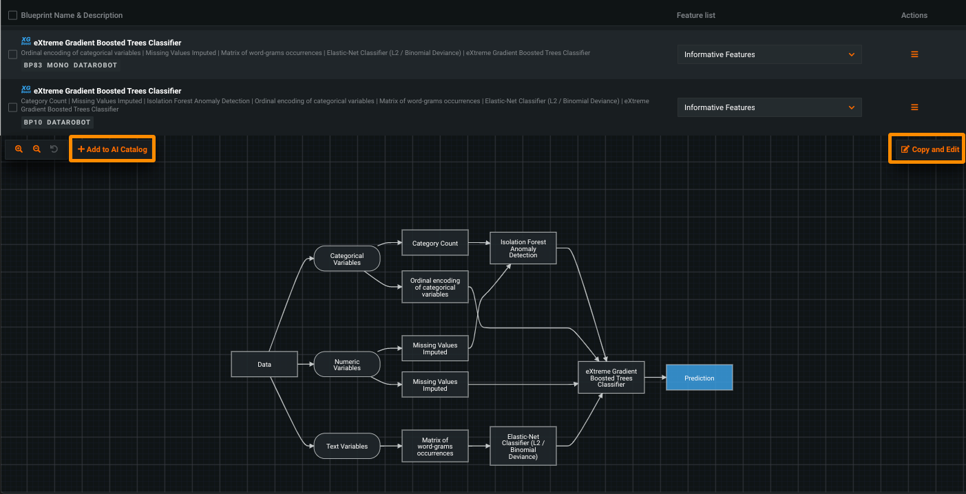 • Click +Add to AI Catalog if you want to save it to the AI Catalog for further editing, use in other projects, and sharing.