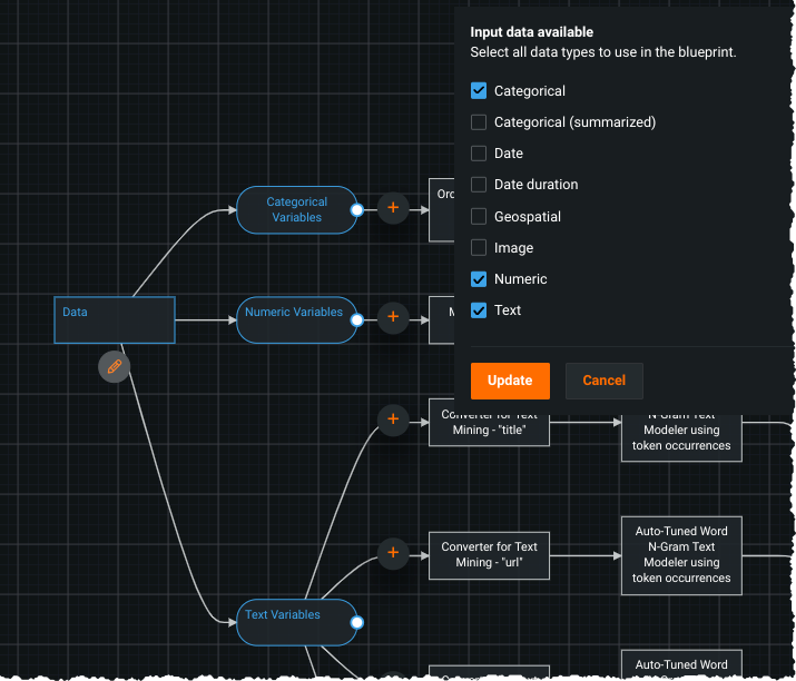 You can change input data types available in a blueprint. Click on the Data node—the editor highlights the node and the included data types. Click the pencil icon to select or remove data types: