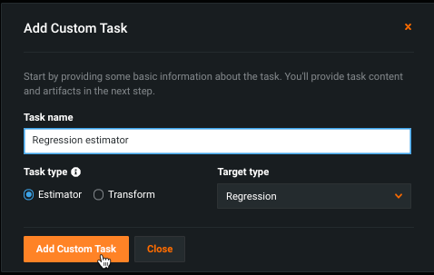 Once the environment is set and the code is uploaded, close the tab. From the Select a task modal, click Refresh to make the new task available. You can find it either by expanding the Custom dropdown or searching: