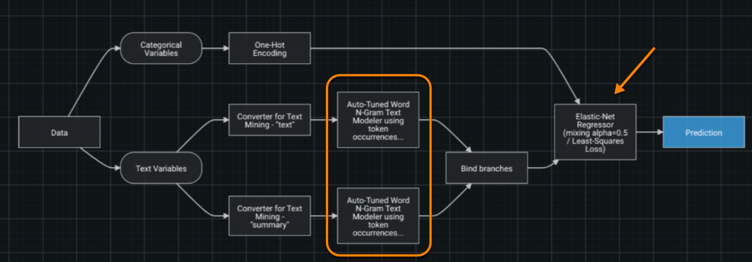 If you create a blueprint that generates a word cloud in both prediction and non-prediction tasks, DataRobot uses the non-prediction vertex to generate the cloud, since that type is always populated with text inputs. For example, in the blueprint below, both the Auto-Tuned Text Model and the Elastic-Net Regressor include a word cloud. In this case, DataRobot defaults to the Auto-Tuned Text Model's non-prediction word cloud.