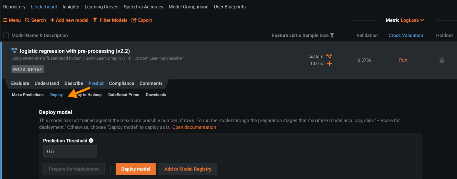 Create and train a blueprint that contains that custom task. The blueprint will then appear on the project’s Leaderboard and can be used just like any other blueprint—in just a few clicks, you can compare it with other models, access model-agnostic insights, and deploy, monitor, and govern the resulting model.