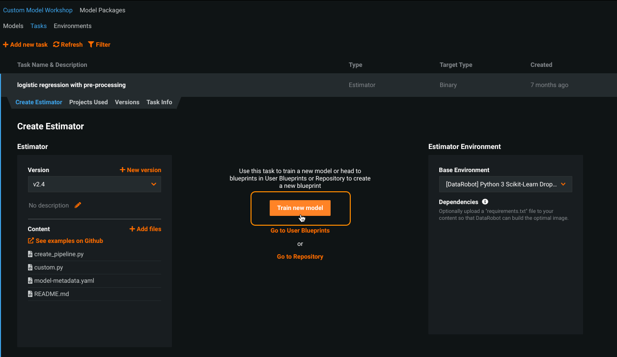 If your custom estimator task contains all the necessary training code, you can build and train a single-task blueprint. To do so, navigate to Model Registry > Custom Model Workshop > Tasks. Select the task and click Train new model: